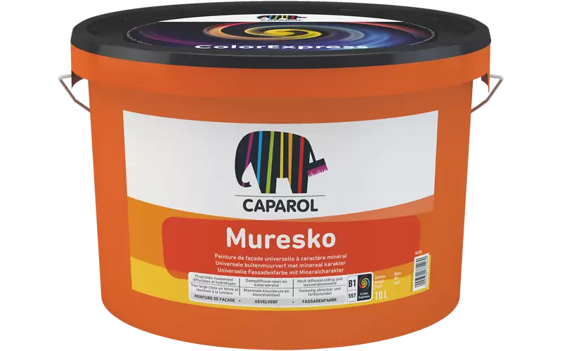 Muresko is een hoogwaardige matte gevelverf op basis van een gesilaniseerd acrylaat (SilaCryl) met siliconentoevoegingen. De verf is breed toepasbaar op uiteenlopende ondergronden zoals pleisterwerk (mineraal/organisch), beton, vezelcement, baksteenmetselwerk en cellenbeton en is ook geschikt voor intacte gevelisolatiesystemen. Afhankelijk van de verdunning kan de verf structuurbehoudend of structuurnivellerend worden verwerkt. Muresko is weerbestendig, niet-verzeepbaar en biedt langdurige bescherming. Let op: dit product wordt via de mengmachine uitsluitend in donkere kleuren gemengd.